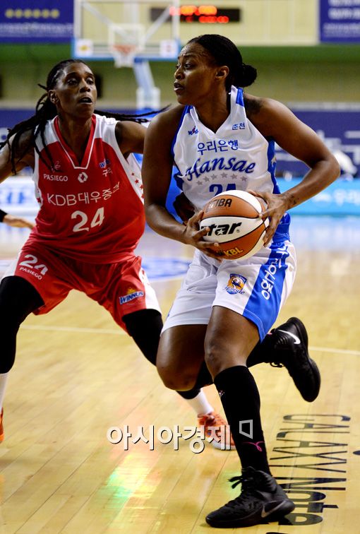 [춘천=아시아경제 김현민 기자] 여자 프로농구 우리은행과 KDB생명의 경기가 19일 춘천호반체육관에서 열렸다. 우리은행 휴스턴이 상대 하지스의 수비를 뚫고 공격하고 있다. 김현민 기자 kimhyun81@asiae.co.kr<ⓒ세계를 보는 창 경제를 보는 눈, 아시아경제(www.asiae.co.kr) 무단전재 배포금지>