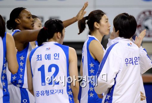 [춘천=아시아경제 김현민 기자] 여자 프로농구 우리은행과 KDB생명의 경기가 19일 춘천호반체육관에서 열렸다. 81-59로 승리하며 역대 개막 최다 연승 타이를 기록한 우리은행 선수들이 기뻐하고 있다. 김현민 기자 kimhyun81@asiae.co.kr<ⓒ세계를 보는 창 경제를 보는 눈, 아시아경제(www.asiae.co.kr) 무단전재 배포금지>
