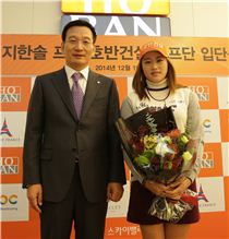 지한솔(오른쪽)이 호반건설과의 조인식 직후 기념 촬영을 하고 있다. 사진=KLPGA 제공