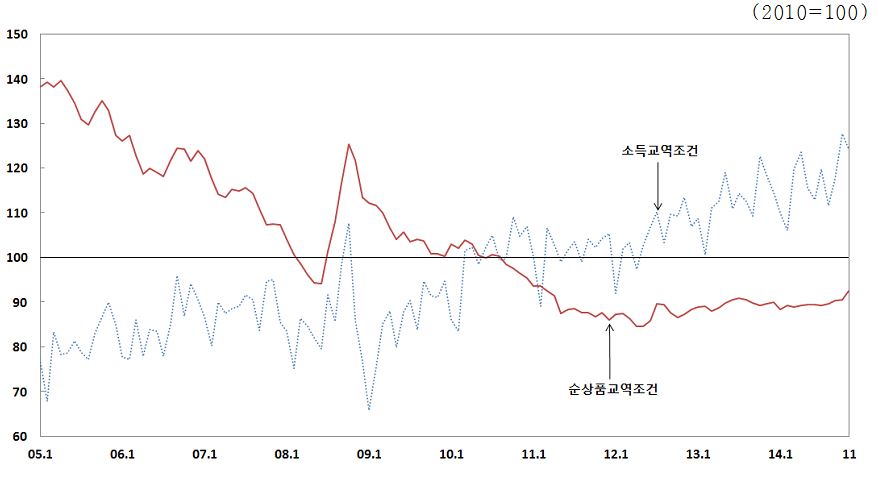 [아시아경제 구채은 기자] 수출입 상품의 교역조건이 석 달째 좋아지고 있다. 국제유가 하락으로 수입가격이 수출가격보다 더 크게 떨어진 데 따른 것이다. 한국은행이 24일 발표한 '11월 무역지수 및 교역조건'에 따르면 한 단위를 수출해 번 돈(달러 기준)으로 수입할 수 있는 상품의 양을 보여주는 순상품교역조건 지수는 11월 92.40으로 1년 전보다 3% 상승했다. 기준연도인 2010년에 한 단위 수출 대금으로 수입할 수 있는 상품이 100개였다면 이제는 92.40개라는 뜻이다. 이는 2011년 3월(92.42) 이후 3년8개월 만에 가장 높은 수준이다. 순상품교역조건지수는 올해 5월 0.4% 하락하고 8월까지 넉 달째 하락했지만 9월 0.6% 반등에 성공한 이후 10월 1.3% 올랐고, 11월 오름폭을 더 키워 3.0% 상승했다. 상승률 기준으로도 지난해 10월(3.2%) 이후 1년1개월만에 최고다. 지난달 수출가격(-4.4%)보다 수입가격(-7.2%) 하락 폭이 더 커져 교역조건이 좋아졌다. 정귀연 한은 물가통계팀 과장은 "양상은 똑같은데 폭이 더 커졌다"면서 "국내에서 정제하는 경유나 휘발유 수출가격도 떨어졌으나 수입해오는 원유나 철광석 등 수출가가 더 크게 떨어진 영향이 컸다"고 말했다. 한 단위가 아닌 전체 수출대금으로 수입할 수 있는 상품의 양을 지수화한 소득교역조건지수는 124.28로 지난해 같은 달보다 4.9% 상승했다.수출물량지수는 134.5로 1년 전보다 1.8% 올랐다. 품목별로는 농림수산품(-18.7%), 섬유 및 가죽제품(-13.6%)이 떨어졌지만, 비금속광물제품(21.7%), 정밀기기(10.5%) 등은 크게 올랐다. 수출금액지수는 작년 동월보다 2.7% 하락했다. 수입물량지수는 115.3으로 2.6% 올랐다. 농림수산품(-3.4%)과 석탄및석유제품(-9.2%)은 떨어졌지만 공산품(4.3%), 일반기계(19.2%) 상승폭이 컸다. 정밀기기(10%), 수송장비(12.6%), 목재 및 종이제품(6.7%) 등이 많이 올랐다. 전년 동기와 비교한 수입금액지수는 117.33으로 4.8% 감소했다. 구채은 기자 faktum@asiae.co.kr<ⓒ세계를 보는 창 경제를 보는 눈, 아시아경제(www.asiae.co.kr) 무단전재 배포금지>