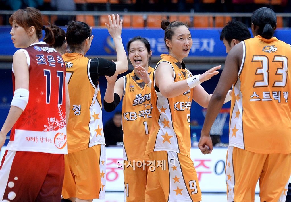 [인천=아시아경제 김현민 기자] 여자 프로농구 신한은행과 KB국민은행의 경기가 22일 인천 도원체육관에서 열렸다. 74-70으로 짜릿한 역전승을 거둔 KB국민은행 홍아란과 정미란이 동료들과 기뻐하고 있다. 김현민 기자 kimhyun81@asiae.co.kr<ⓒ세계를 보는 창 경제를 보는 눈, 아시아경제(www.asiae.co.kr) 무단전재 배포금지>