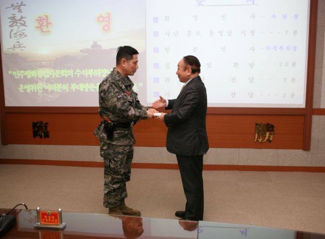 현경대 민주평통 수석부의장이 23일 해병대 2사단을 방문해 전진구 사단장에게 위문금을 전달하고 있다.(사진제공=민주평통)