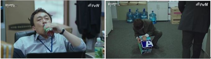 미생 속 PPL. (좌)오상식 과장이 전날 과음후 '컨디션 헛개수'를 들이키고 있다. (우)장그래가 복사를 위해 더블에이 A4용지 박스를 뜯고 있다.[출처:tvN 캡처]