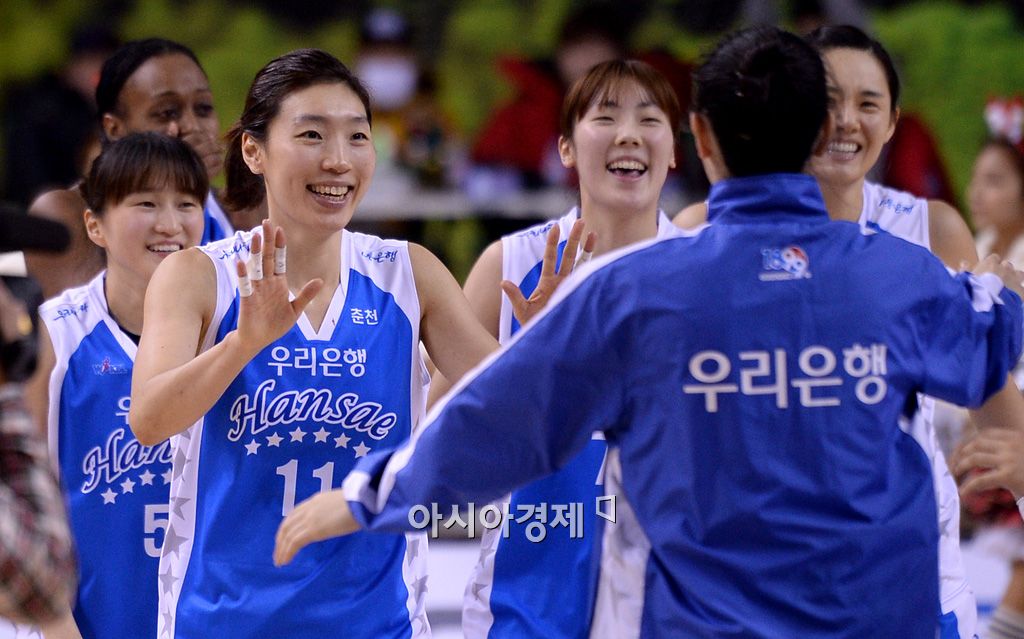 [용인=아시아경제 김현민 기자] 여자 프로농구 우리은행이 역대 개막 최다 연승 신기록(16연승)을 달성했다. 우리은행은 24일 용인실내체육관에서 열린 삼성과의 원정경기에서 65-62로 승리했다. 우리은행 선수들이 기뻐하고 있다. 김현민 기자 kimhyun81@asiae.co.kr<ⓒ세계를 보는 창 경제를 보는 눈, 아시아경제(www.asiae.co.kr) 무단전재 배포금지>