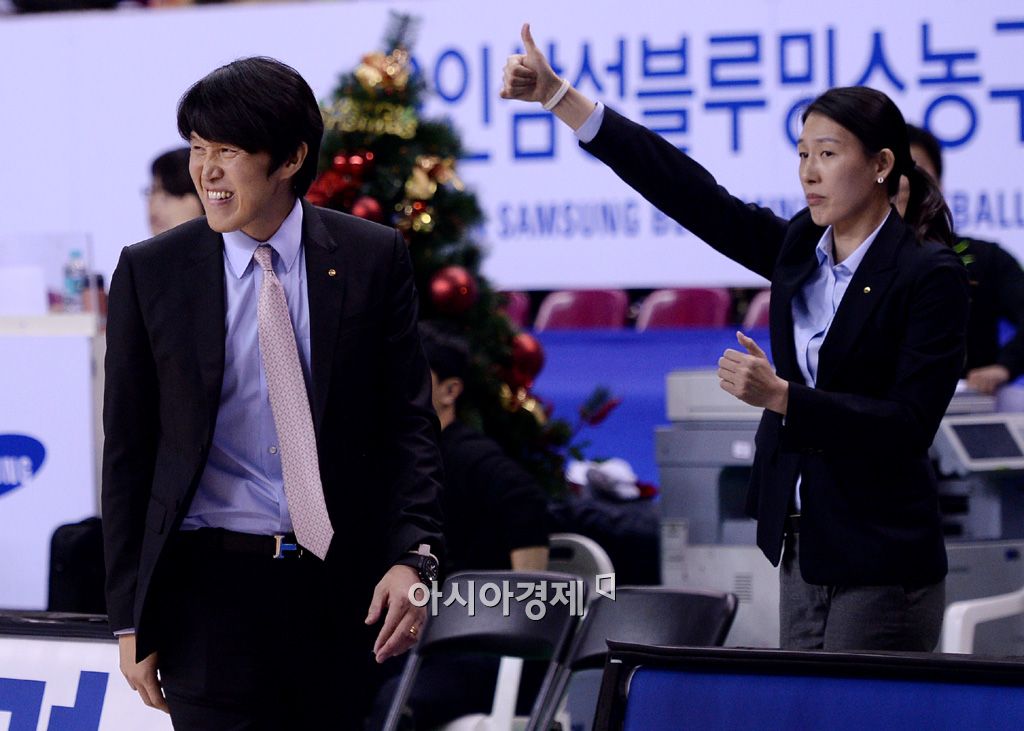 [용인=아시아경제 김현민 기자] 여자 프로농구 우리은행이 역대 개막 최다 연승 신기록(16연승)을 달성했다. 우리은행은 24일 용인실내체육관에서 열린 삼성과의 원정경기에서 65-62로 승리했다. 우리은행 위성우 감독이 4쿼터 막판 승기를 잡고 미소짓고 있다. 김현민 기자 kimhyun81@asiae.co.kr<ⓒ세계를 보는 창 경제를 보는 눈, 아시아경제(www.asiae.co.kr) 무단전재 배포금지>
