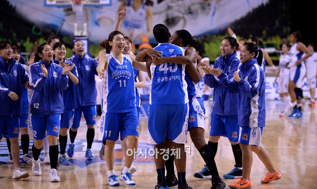 [용인=아시아경제 김현민 기자] 여자 프로농구 우리은행이 역대 개막 최다 연승 신기록(16연승)을 달성했다. 우리은행은 24일 용인실내체육관에서 열린 삼성과의 원정경기에서 65-62로 승리했다. 우리은행 선수들이 기쁨을 나누고 있다. 김현민 기자 kimhyun81@asiae.co.kr<ⓒ세계를 보는 창 경제를 보는 눈, 아시아경제(www.asiae.co.kr) 무단전재 배포금지>
