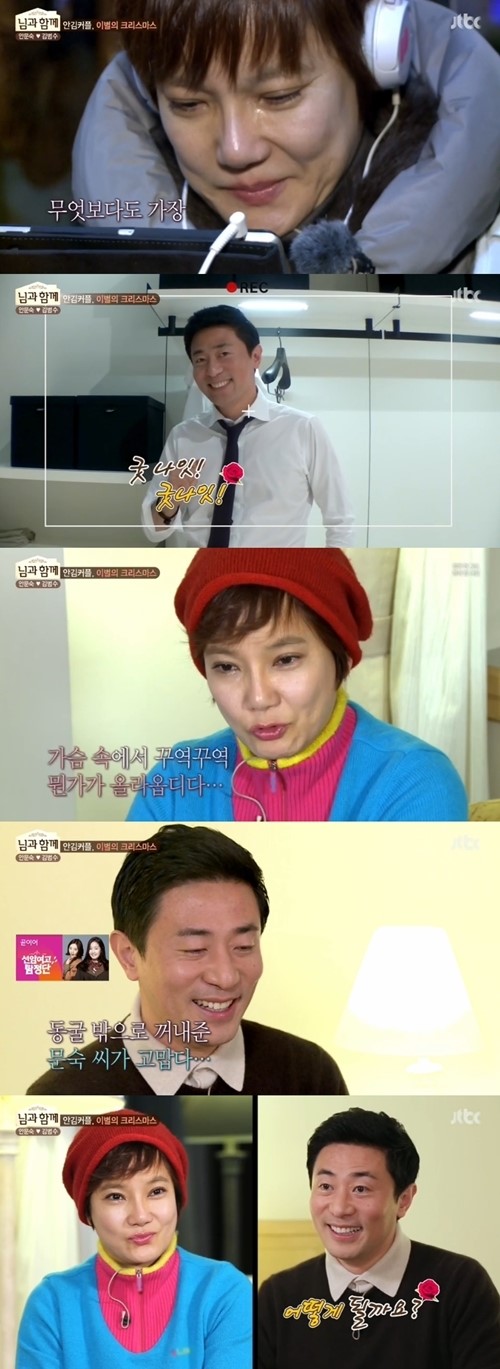 안문숙, 마지막 여행서 김범수 이벤트에 눈물만 펑펑…대체 어땠길래[아시아경제 온라인이슈팀] 지난 23일 방송된 JTBC 예능 '님과 함께'에서는 홋카이도 여행을 떠나 마지막 데이트를 즐기는 안문숙과 김범수의 모습이 그려졌다.홋카이도의 중심 도시인 삿포로를 찾은 김범수와 안문숙은 새하얀 눈이 내리는 삿포로에서 명물 털게 식당, 반짝반짝 일루미네이션으로 꾸며진 오도리 공원 등을 함께 걸었다.김범수와 안문숙은 문득 마지막 데이트라는 사실을 떠올리며 장소를 불문하고 서로에게 아쉬움과 감사함을 아낌없이 표현했다.이별을 앞둔 두 사람이지만 밝은 모습으로 삿포로를 여행했다. 털게 식당에서 식사를 하게 된 김범수는 안문숙에게 게살을 발라 한입 먹여줬다. 이어 두 사람은 어색했던 첫만남과 솜사탕키스 등 함께했던 순간을 떠올리며 추억을 공유했다.안문숙은 인터뷰에서 "퍽퍽했던 내 삶에 단비와 같던 순간들이다. 정말 소중하다. 소중한 종합선물을 받은 느낌이다"라고 말했다. 김범수는 가장 기억에 남는 순간을 묻는 질문에 "오늘 이 하루가 평생 잊지 못할 순간 중 하나다"라고 전했다.마지막 데이트의 대미를 장식한 것은 바로 김범수가 한국에서부터 몰래 준비해 온 정성 가득한 이벤트였다.김범수는 "커피를 사 올 테니 음악을 듣고 있으라"며 안문숙에게 태블릿 PC를 건넸다. 태블릿 PC에는 김범수의 친구 사진작가 조세현, 배우 박철 등이 등장해 응원 메시지를 보냈다.박철은 "인륜지대사는 신중해야 한다. 하지만 너무 신중해서 40년 동안 혼자였던 것 같다. 부담 느끼지 말고 받아들여라. 가만히 있으면 김범수가 다 해줄 거다"라고 메시지를 남겨 눈길을 끌었다.마지막으로 김범수의 메시지가 공개됐다. 그는 "첫 만남 때 차 안에서 해준 말이 있다. '범수 씨 힘들고 지쳐보이는데 나랑 있는 시간만큼은 편하게 해달라'고 했다. 위로가 되는 말이었고 위안이 됐다. 그 한마디 때문에 용기를 낼 수 있었다"며 안문숙에게 고마운 마음을 전했다.또 그는 "무엇보다 가장 미안하고 가슴 아픈 건 남자답게 적극적으로 행동하지 못해 아쉽고 미안하다는 생각이 든다"라고 말했다.예상하지 못한 깜짝 이벤트와 절친 박철의 진심어린 조언에 결국 안문숙은 눈물을 펑펑 흘렸다.김범수는 제작진과의 마지막 인터뷰에서 "두 분은 어떻게 되는 건가요?"라는 질문에 "어떻게 될까요?"라고 반문해 기대감을 높였다.소식을 접한 누리꾼은 "김범수 안문숙, 아쉽다" "김범수 안문숙, 마지막이라니" "김범수 안문숙, 꿀잼인데" "김범수 안문숙, 연장하라" "김범수 안문숙, 보기 좋았는데" "김범수 안문숙, 더 보고 싶다" "김범수 안문숙, 파이팅" "김범수 안문숙, 짱짱" 등의 반응을 보였다.온라인이슈팀 issue@asiae.co.kr<ⓒ세계를 보는 창 경제를 보는 눈, 아시아경제(www.asiae.co.kr) 무단전재 배포금지>