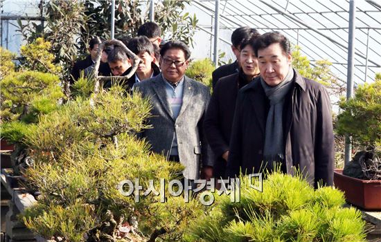 이낙연 전남도지사가 25일 무안 해제분재원을 찾아 조형미를 뽐내는 분재들을 둘러보고 있다. 이 지사는 이날 천사섬 분재공원과 무안 현대영농조합, 무안 해제분재원을 차례로 방문해 생산농가의 현황을 살피고 농업과 임업분야의 산업화 방안을 논의했다. 사진제공=전남도 <br />