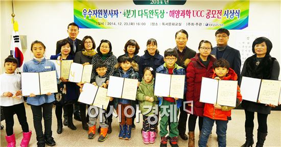 목포공공도서관(관장 이한근)은 지난 23일 도서관 4층 독서문화교실에서 한해를 마무리하는 ‘2014년 우수자원봉사자·4분기 다독완독상·해양과학UCC공모전 시상식’을 개최했다.<br />