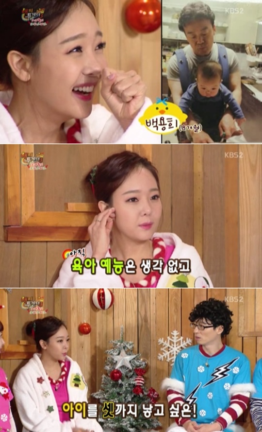 소유진 아들, 백종원 닮은 '귀요미'…"아이 셋 정도 낳고 파"[아시아경제 온라인이슈팀]소유진이 방송에서 남편 백종원과 아들 백용희에 대한 애정을 드러냈다. 25일 밤 방송된 KBS2 '해피투게더 시즌3'은 MC 유재석, 박명수, 박미선, 김신영, 조세호 진행 아래 게스트 소유진, 슈(유수영), 김소은, 카라 허영지가 출연해 '크리스마스 특집'으로 꾸며졌다. 이날 MC들은 얼마 전에 득남한 소유진에게 축하 인사를 건네며 "남편 사랑 받고 아이 얻고 완벽하다"라고 이야기했다. 소유진은 아들에 대해 "아기가 남편 닮았다고 하는데, 전체적인 구조 골격은 남편 닮았는데 부분부분은 저 닮은 것 같기도 하다"라고 이야기했다.이후 소유진의 아들 백용희 군의 모습이 최초 공개됐고 아버지 백종원을 꼭 닮은 모습이 눈길을 모았다. 특히 영상으로 공개된 남편과 아들의 모습에 사진만봐도 흐뭇한 듯 연신 함박웃음을 지어 보는 이들까지 훈훈하게 만들었다. 이어 '육아 예능 출연'에 대한 생각을 묻는 유재석의 질문에 "육아 예능 출연에 대한 생각은 없다. 나도 (슈처럼) 아이를 셋 정도는 낳고 싶다"고 전해 눈길을 끌었다. 방송을 접한 네티즌들은 "소유진 백종원 아들, 둘 다 반반 닮았네" "소유진 백종원 아들, 행복해보이네", "소유진 백종원 아들, 너무 귀여워" 등의 반응을 보였다.온라인이슈팀 issue@asiae.co.kr<ⓒ세계를 보는 창 경제를 보는 눈, 아시아경제(www.asiae.co.kr) 무단전재 배포금지>