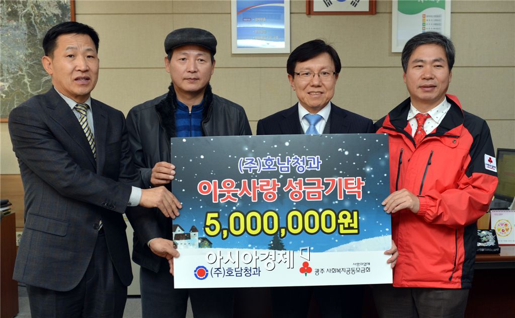 "성금 500만원과 과일 100만원 상당 기탁"[아시아경제 노해섭 기자](주)호남청과(대표 고인수)가 광주사회복지공동모금회의 ‘희망2015 나눔캠페인’에 동참하기 위해 이웃돕기성금 500만원과 100만원 상당의 과일을 광주광역시에 기탁했다.26일 오후 4시 시청 3층 접견실에서 열린 전달식에는 오형국 행정부시장과 ㈜호남청과 고인수 대표 등 3명, 광주사회복지공동모금회 김재규 부회장 등 7명이 참석했다.㈜호남청과는 지난 1988년 ㈜호남농산물 창립총회에서 설립한 도매시장법인으로, 2009년 중소기업청으로부터 경영혁신 중소기업의 선정됐다. 지난해 매출액이 1154억원에 달하고, 임원 11명과 직원 24명 등 35명이 근무하고 있다. 고인수 대표이사는 2002년 대표이사로 취임, 2002년과 2013년에 지역발전 공로를 인정받아 시장표창을 받았다. 광주사회복지공동모금회는 지난 11월20일부터 내년 1월31일까지 73일 간 34억원을 목표로 이웃돕기성금을 모금하고 있다. 26일 현재 모금액은 12억4000여 만원으로 사랑의 행복온도는 36도다.한편, 지난해 ‘희망2014나눔캠페인’은 지역 기업과 시민 참여로 성금목표액 32억원 보다 1억원 많은 33억원이 모금돼 목표액을 초과 달성했다.오형국 시 행정부시장은 “최근 극심한 경기 침체로 살림살이가 팍팍해져 공공요금도 못내는 저소득층이 늘어나면서 어느해 보다 힘겨운 겨울나기를 하고 있다”며 “한마음 한뜻으로 정성을 모으면 ‘사랑의 온도탑 눈금’이 쑥쑥 올라가고 정이 퍼져 나갈 것으로 기대한다”고 말했다. 노해섭 기자 nogary@<ⓒ세계를 보는 창 경제를 보는 눈, 아시아경제(www.asiae.co.kr) 무단전재 배포금지>