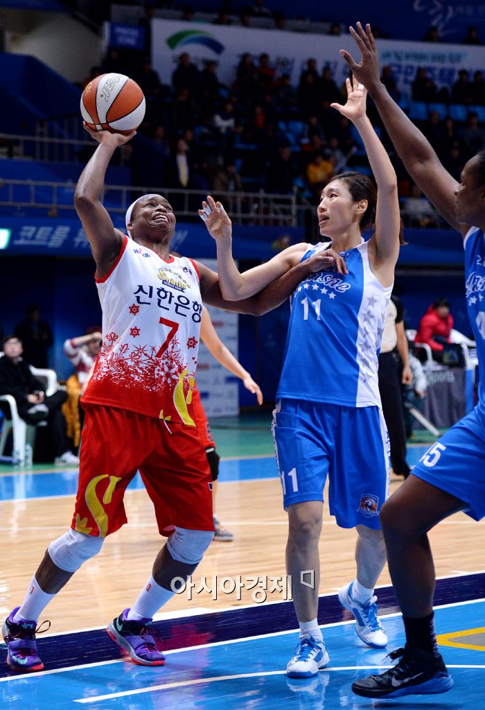 [인천=아시아경제 김현민 기자] 여자 프로농구 신한은행과 우리은행의 정규리그 경기가 26일 인천 도원체육관에서 열렸다. 신한은행 크리스마스가 상대 임영희의 수비를 뚫고 공격하고 있다. 우리은행은 16연승으로 개막 최다 연승 신기록 행진을 하고 있다. 김현민 기자 kimhyun81@asiae.co.kr<ⓒ세계를 보는 창 경제를 보는 눈, 아시아경제(www.asiae.co.kr) 무단전재 배포금지>