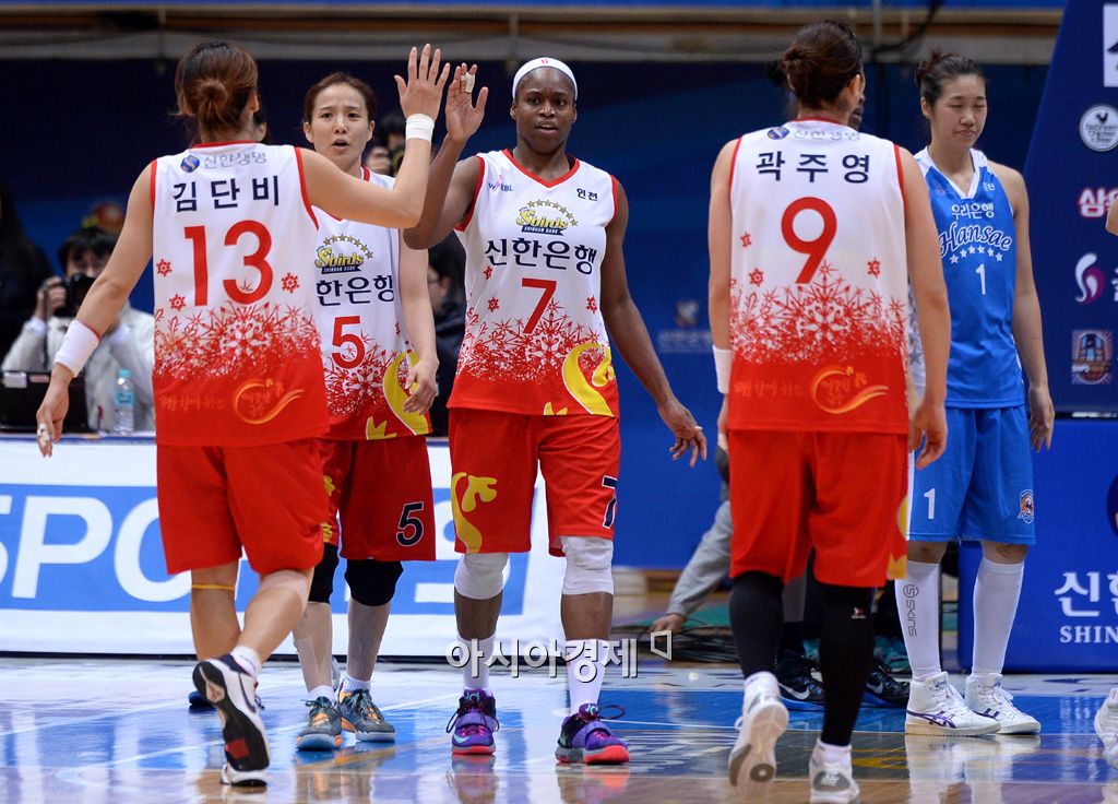 [인천=아시아경제 김현민 기자] 여자 프로농구 신한은행과 우리은행의 정규리그 경기가 26일 인천 도원체육관에서 열렸다. 신한은행 크리스마스가 득점에 성공한 뒤 동료들과 하이파이브하고 있다. 우리은행은 16연승으로 개막 최다 연승 신기록 행진을 하고 있다. 김현민 기자 kimhyun81@asiae.co.kr<ⓒ세계를 보는 창 경제를 보는 눈, 아시아경제(www.asiae.co.kr) 무단전재 배포금지>