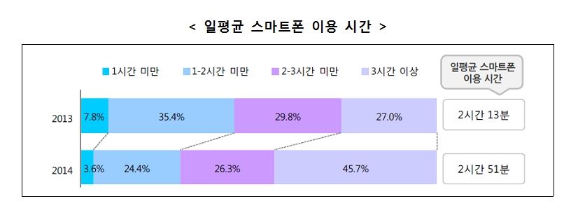 인터넷진흥원, 2014 모바일인터넷이용실태조사 결과 발표 모바일인터넷, 가정·스마트폰·LTE로 이용 증가 [아시아경제 이초희 기자] 60대 이상 모바일인터넷 이용자의 94%는 검색서비스를 이용하고 있는 것으로 나타났다. 인터넷 이용시간은 2시간51분으로 지난해보다 38분 늘었으며 20~30대 이용자가 타 연령에 비해 많았다. 한국인터넷진흥원(KISA·원장 백기승)과 미래창조과학부는 모바일 단말기를 통한 인터넷 및 모바일인터넷 서비스 이용 행태, 스마트폰 이용 현황 등을 조사한 2014년 모바일인터넷이용실태조사 결과를 29일 발표했다.조사 결과에 따르면 스마트폰 이용자가 인지하는 일일 평균 스마트폰 이용 시간은 2시간51분으로 전년 대비 38분가량 증가했다. 특히 3시간 이상 이용자 비율이 45.7%로 18.7%포인트 증가했으며, 그중 20대와 30대의 증가 폭이 각각 전년 대비 22.5%포인트(20대), 23.0%포인트(30대)로 타 연령대에 비해 상대적으로 높았다.모바일인터넷 접속 단말기로는 조사대상의 98.3%가 스마트폰으로 모바일인터넷을 이용하였으며, 접속 방법으로는 롱텀에볼루션(LTE) 접속 비율이 86.9%로 전년 대비 크게 증가(24.4%포인트)한 것으로 나타났다. 이는 지난해 LTE-A 서비스가 상용화 되면서 LTE를 통한 모바일인터넷 이용률이 급격히 상승한 것으로 분석된다.모바일인터넷 이용 빈도 및 시간은 일평균 12.8회, 1시간 44분이었으며, 모바일 단말기별로는 스마트폰의 이용 빈도 및 시간이 12.7회, 1시간 36분으로 스마트패드 등 다른 모바일 단말기에 비해 높게 나타났다.모바일인터넷을 주로 이용하는 장소로는 ‘가정(92.4%)’과 ‘이동 중인 교통수단 안(86.7%)’이라는 응답이 가장 많았다. 향후에도 ‘지하철 역내, 버스 정류장(70.3%)’ ‘이동 중인 교통수단 안(57.5%)’에서 무선랜 이용을 가장 희망하는 것으로 조사됐다.모바일인터넷의 주 이용 목적으로는 정보 검색 및 일반적인 웹서핑 등의 ‘자료 및 정보습득(99.0%)’, 메신저, 소셜네트워크서비스(SNS) 등의 ‘커뮤니케이션(97.5%)’, 게임, 비디오, 음악 플레이 등의 ‘여가 활동(89.1%)’ 순으로 조사돼, 일상생활 전반에서 모바일인터넷 이용이 확대되고 있는 것으로 보인다.특히 모바일인터넷 이용자의 대부분이 사용하는 모바일 검색서비스 이용률(99.1%)은 6~9세(87.8%)를 비롯 60대 이상(94.0%)에서도 높게 나타났으며, 이용 유형으로는 ‘키보드 검색(99.5%)’이 가장 많고, ‘위치기반 검색(41.7%)’ ‘소셜 검색(24.8%)’ 등 순으로 조사됐다.모바일인터넷에 대한 만족도는 ‘접속 속도(82.5%)’ ‘접속 품질(74.5%)’ ‘콘텐츠 및 서비스의 다양성(70.4%)’ ‘단말기 기능 및 조작의 편리성(69.9%)’ 등에서 전년 대비 대체로 상승했다. 반면 ‘이용 요금(36.6%)’과 ‘단말기 가격(30.4%)’에 대한 만족도는 상대적으로 낮았다.KISA는 빠르게 성장하고 있는 모바일 환경 속에서 국내 모바일인터넷 이용환경을 조성, 모바일인터넷과 결합한 서비스 산업시장 현황을 파악하기 위한 기초자료를 충실히 제공해 나갈 계획이다.한편 이번 조사는 지난 6월 한 달 동안 전국 만 6세 이상의 모바일인터넷이용자 6000명을 대상으로 이뤄졌다. 자세한 결과는 한국인터넷진흥원 인터넷통계정보시스템 홈페이지(isis.kisa.or.kr)에서 확인할 수 있다.이초희 기자 cho77love@asiae.co.kr<ⓒ세계를 보는 창 경제를 보는 눈, 아시아경제(www.asiae.co.kr) 무단전재 배포금지>