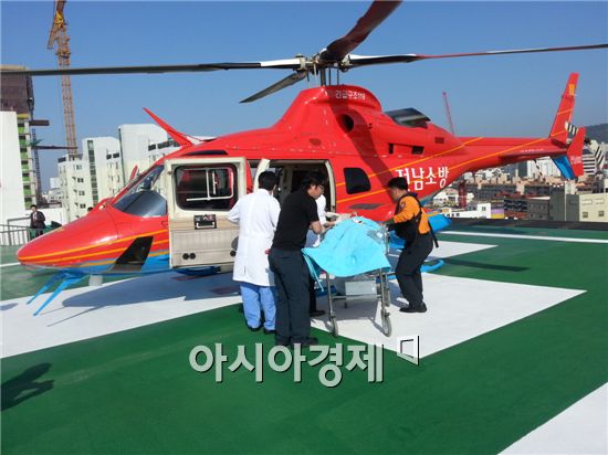 전남소방헥기 환자를 이송하고 있다.
