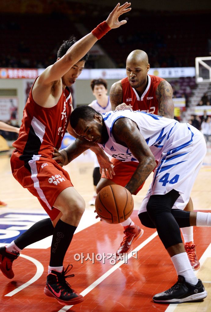 [안양=아시아경제 김현민 기자] 프로농구 안양 KGC와 서울 삼성의 경기가 30일 안양실내체육관에서 열렸다. 삼성 라이온스가 상대 양희종의 수비에 막혀 볼을 놓치고 있다. 김현민 기자 kimhyun81@asiae.co.kr<ⓒ세계를 보는 창 경제를 보는 눈, 아시아경제(www.asiae.co.kr) 무단전재 배포금지>