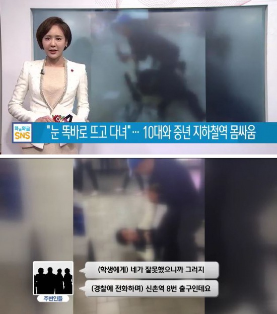 "눈깔 똑바로 뜨고 다녀" 지하철역서 몸싸움 영상 화제, 싸움 건 10대 결국…[아시아경제 온라인이슈팀] 서울 지하철 2호선 신촌역에서 벌어진 성인 남성과 고등학생의 몸싸움 영상이 페이스북 등 각종 SNS에서 화제다. 30일 페이스북 페이지 '유머저장소'에 '수도, 서울, 지하철 대참사'라는 제목의 영상이 공개됐다. 영상 속에는 성인 남성과 학생이 격렬한 몸싸움을 벌이고 있는 장면이 담겨 있다. 주위에 사람이 몰려들어도 아랑곳하지 않는 모습이다. 체구가 왜소한 학생은 남성에게 우산을 휘두르며 반항했지만 이내 곧 제압당한다. 학생은 제압을 당하는 와중에도 욕설을 멈추지 않아 남성의 화를 돋우고 있다. 게시글에 따르면 영상 속 남성과 학생은 지하철역에서 어깨를 부딪쳤다. 이에 고등학생으로 보이는 학생이 "눈깔 똑바로 뜨고 다녀, 병X아"라며 남성에게 욕설을 뱉은 것이 싸움의 원인으로 알려졌다. 영상은 남성이 학생을 경찰에 신고하며 끝을 맺는다. 누리꾼들은 대체로 예의 없는 학생이 제대로 임자를 만났다는 반응이다. 이 영상을 접한 누리꾼들은 "집에서 오냐오냐 해서 그런 듯하네요" "신촌 한복판서 너무했다" "혼 좀 나야한다" 등의 반응을 보였다. 하지만 실상은 달랐다. 영상 속 젊은 남성의 나이도 10대가 아닌 아내를 둔 20대로 밝혀졌다. 마포경찰서 관계자에 따르면 "인터넷에선 젊은 남성이 '나쁜 사람'처럼 알려져 있는데 사실은 그렇지 않다"며 "단순폭행으로 상호 합의하에 종결된 사건"이라고 말했다.영상속의 젊은 남성 A씨가 신촌역사 내에서 전화통화를 하는데 술을 마신 중년남성 B씨가 쳐다봤다. 이 과정에서 욕설이 오가며 시비가 붙었고 B씨가 갑자기 A씨의 뒤통수를 때렸다는 것이다.온라인이슈팀 issue@asiae.co.kr<ⓒ세계를 보는 창 경제를 보는 눈, 아시아경제(www.asiae.co.kr) 무단전재 배포금지>