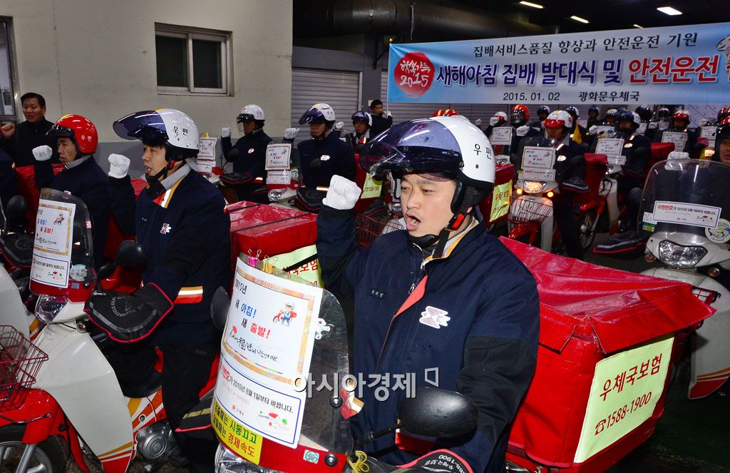 [아시아경제 백소아 기자] 2일 서울 광화문우체국에서 열린 '2015 희망출발 집배 발대식 및 안전운전 결의대회'에서 집배원들이 안전운전 10대 수칙을 다짐하고 있다.백소아 기자 sharp2046@asiae.co.kr<ⓒ세계를 보는 창 경제를 보는 눈, 아시아경제(www.asiae.co.kr) 무단전재 배포금지>
