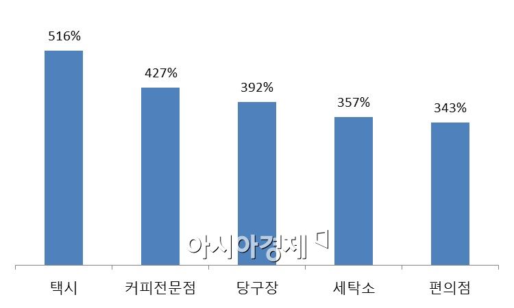 [아시아경제 조은임 기자] 카드로 '택시'를 이용한 금액이 지난해 4조원을 넘어서면서 5년간 가장 크게 늘어난 것으로 나타났다. 소액 결제가 늘어나고 비접촉(RF) 카드결제가 보편화되면서 일어난 변화다. 4일 KB금융지주경영연구소의 '2015년 한국 신용카드 시장 전망'에 따르면 지난해 택시를 신용·체크카드로 이용한 금액은 총 4조2000억원으로 2009년 5900억원보다 516% 증가했다. 택시의 뒤를 이어 카드 결제금액 성장률이 가장 높았던 업종은 커피전문점으로, 지난해 결제금액은 3조7000억원으로 2009년 6600억원보다 427% 늘었다.