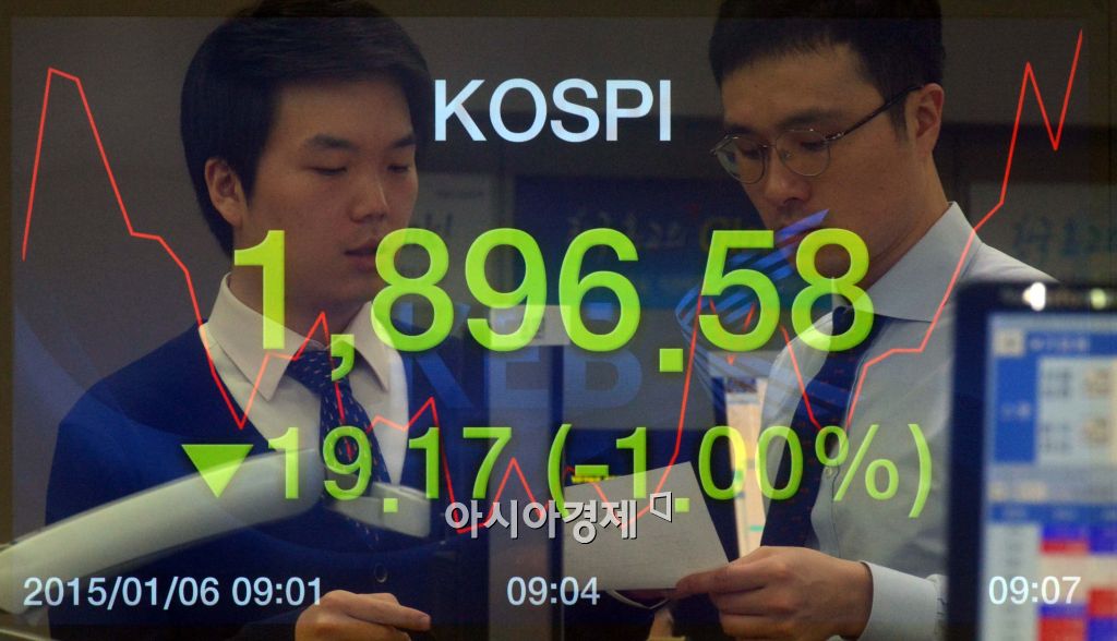 [아시아경제 최우창 기자] 코스피지수가 유가와 그리스 악재로 동반 하락한 미국, 유럽증시의 영향으로 1900선이 붕괴됐다. 6일 서울 명동 외환은행 본점 딜링룸의 전광판에 코스피 지수가 전거래일보다 19.17포인트(1.00%) 하락한 1896.58를 나타내고 있다.(다중노출 2회 촬영)최우창 기자 smicer@asiae.co.kr<ⓒ세계를 보는 창 경제를 보는 눈, 아시아경제(www.asiae.co.kr) 무단전재 배포금지>