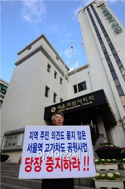▲서울시의회에서 한 시민이 '서울역 고가프로젝트'를 반대하고 있다.