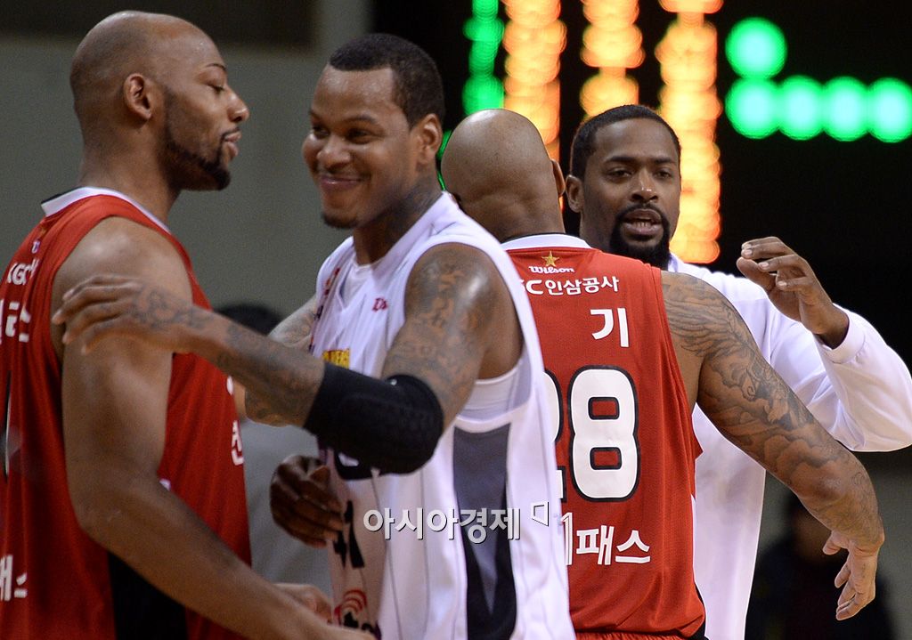 [안양=아시아경제 김현민 기자] 프로농구 안양 KGC와 창원 LG의 경기가 7일 안양실내체육관에서 열렸다. 102-85로 승리를 거둔 LG 제퍼슨과 메시가 KGC 윌리엄스·맥기와 인사를 나누고 있다. 김현민 기자 kimhyun81@asiae.co.kr<ⓒ세계를 보는 창 경제를 보는 눈, 아시아경제(www.asiae.co.kr) 무단전재 배포금지>