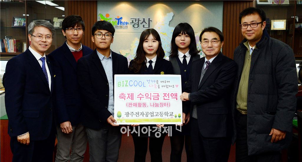 광주전자공업고등학교(학교장 장기석, 이하 전자공고) 학생들이 학교축제에서 마련한 수익금을 광산구 복지사각지대 해소를 위한 ‘투게더광산 나눔문화재단’에 기탁했다. <br />