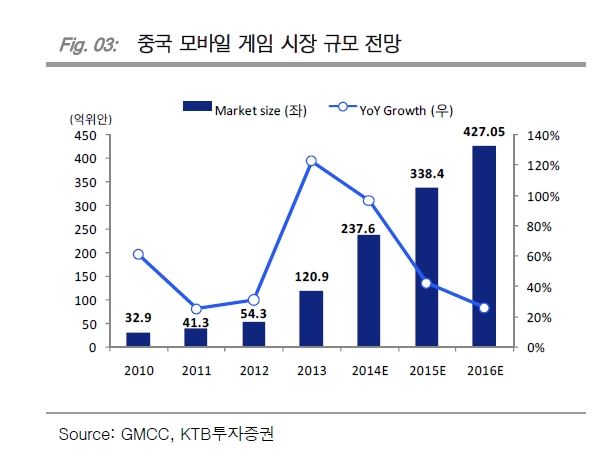 중국 모바일게임 시장 2016년 7조5000억원 성장현재 서비스중인 모바일 게임수만 1만개 넘어 공급과잉10개 중 9개는 적자[아시아경제 이초희 기자]'중국에서 한방 터트리면 끝난다?'게임시장의 '중국대박론'과 관련해 투자에 신중할 필요가 있을 것으로 보인다. 중국 모바일 게임사 10개 중 9개는 적자인 것으로 나타났다. 지나친 성공기대감을 낮출 필요가 있다는 지적이다.14일 관련업계에 따르면 중국의 시장 조사기관인 엔포데스크(Enfodesk)의 최근 발표 결과 지난해 중국 모바일게임시장 규모는 237억RMB (4조1000억원)이며 2016년에는 427억RMB (7조5000억원)로 성장할 것으로 전망된다.그러나 중국 모바일게임 회사의 10개 중 9개는 적자로 나타났다. KTB투자증권에 따르면 중국 모바일게임사 92%는 공급과잉에 따른 적자 상태다. 중국에서 매주마다 100개가 넘는 모바일게임이 출시되고 있으며 지난해에는 4000개가 론칭됐다. 현재 서비스 중인 모바일게임 수는 1만개가 넘는 것으로 파악된다.이 중 1%만이 월 5000만 RMB (월 90억원 이상)가 넘는 큰 성공을 하고, 2%가 작은 성공인 월 500만RMB 이상 (월 9억원 이상), 5%의 게임은 BEP 수준에 머물고 있는 것으로 나타났다. 이는 출시된 게임 중 92%는 적자 상태임을 의미하는 것이다.다만 중국의 1위 게임의 일매출은 30억원 이상으로 더 커지고 있는 상황이다. 최근 도탑전기는 월매출 2억7000만 RMB (월 480억원)를 달성했다고 발표하는 등 1~2위가 전체 시장을 장악하고 있는 것으로 나타났다.최찬석 KTB투자증권 연구원은 "텐센트와 퍼블리싱 계약을 체결했다고 해서 모두 서비스, 성공에 이르는 것은 아니다"며 "텐센트는 다수의 까다로운 QC(Quality Control) 기준을 가지고 있으며 이를 모두 통과할 가능성이 높지는 않다"고 밝혔다. 특히 텐센트의 지분 투자를 받지 않은 퍼블리싱 게임들의 최종 론칭 확률은 낮은 편이라고 설명했다..