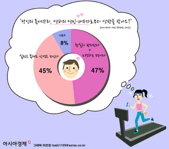 [아시아경제 김소연 기자]'백지영-정석원', '한혜진-기성룡' 등 연상녀-연하남 커플은 일반적인 현상을 넘어 미혼 여성들의 부러움을 받는 선망의 대상이다. 이처럼 연하남들에게 인기 있는 연상녀들의 공통점은 무엇일까. 바로 철저한 '자기관리'다.15일 결혼정보회사 가연과 비만치료 특화 의료기관 365mc 비만클리닉(이하 365mc)이 지난 12월 17일부터 1월 7일까지 20~30대 여성 559명을 대상으로 진행한 설문조사 결과에 따르면 연하의 연인 또는 배우자가 있는 여성들의 경우 몸매관리에 각별히 신경 쓰는 것으로 나타났다.'당신의 몸매관리, 연하의 연인·배우자로부터 영향을 받나요?'라는 질문에 '확실히 관리한다', '노력하는 편이다'라고 응답한 참가자가 각각 20%(111명)와 27%(149명)를 차지해 전체 참가자의 47%는 연하의 연인·배우자로 인해 몸매관리에 노력을 기울인다는 것으로 나타났다.또 '실천은 잘 못해도 늘 신경은 쓰인다'고 답한 응답자도 45%에 달했다.결혼정보회사 가연의 이은주 커플매니저는 “연상녀 연하남 커플도 많아지고 있을 뿐 아니라 만남에 있어서 연상녀와 연하남에 대해 수용적인 회원들도 많아지고 있다. 앞서 가연에서 실시한 설문조사 결과를 보면 ‘연하남의 매력조건’ 1위로 ‘풋풋한 외모’가 꼽힌 바 있다. 그런 만큼 여성들도 연하남과의 교제 시 외모에 신경을 많이 쓰는 경향이 있는 것 같다”고 전했다. 그렇다면 연하의 연인, 남편에게 매력지수 200% 어필할 수 있는 몸매관리 비법은 뭘까.서울, 대전, 부산에 지방흡입센터를 둔 365mc 김하진 대표병원장(서울365mc병원)은 “여성은 30세, 남성은 40세가 지나면 각종 호르몬이 감소되고 근육량이 줄어들면서 나잇살이 증가하는 단계로 접어든다. 보통 아랫배로 시작해 엉덩이와 허벅지, 팔뚝으로 이어진다”며 “나잇살을 관리하는 첫 걸음은 평소보다 적게 먹고 하루 10분이라도 꾸준한 운동을 하는 것”이라고 강조했다.김소연 기자 nicksy@asiae.co.kr<ⓒ세계를 보는 창 경제를 보는 눈, 아시아경제(www.asiae.co.kr) 무단전재 배포금지>