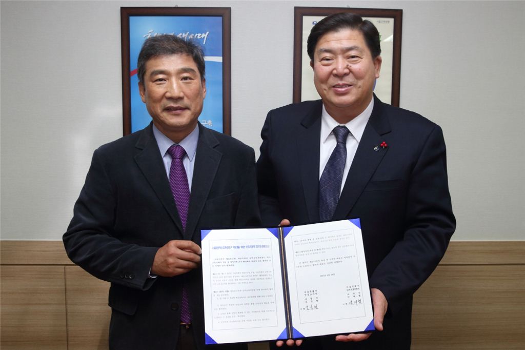 조길형 영등포구청장(오른쪽)과 안재협 서울남부교육지원청교육장(왼쪽)이 업무협약을 맺고 기념촬영을 하고 있다.<br />