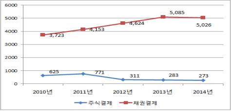 최근 5년간 증권유형별 결제금액 추이(출처: 한국예탁결제원)