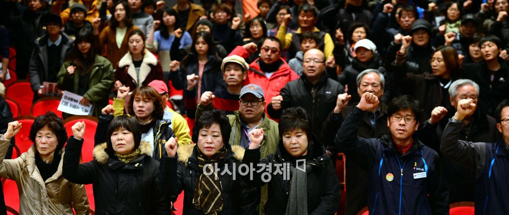 [아시아경제 최우창 기자]16일 서울 조계사 역사문화박물관 전통문화예술공연장에서 용산참사 6주가 추모문화제가 열린 가운데 참석자들이 구호를 외치고 있다.최우창 기자 smicer@asiae.co.kr<ⓒ세계를 보는 창 경제를 보는 눈, 아시아경제(www.asiae.co.kr) 무단전재 배포금지>