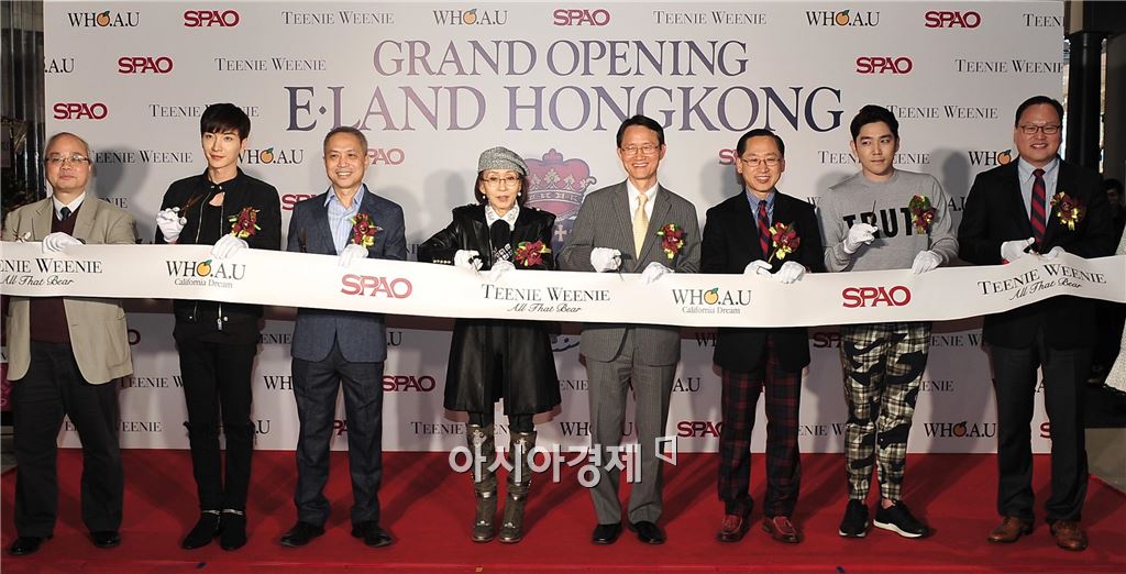 이랜드그룹이 16일 홍콩 디-파크 쇼핑몰에 국내 기업 중 최대규모의 복합관 오픈 행사를 진행했다. 이날 오픈 행사에는 이랜드 박성경 부회장(사진 왼쪽에서 네번째)과 조용천 홍콩 총영사(왼쪽에서 다섯번째), 홍콩 신세계그룹 천관잔 사장(왼쪽에서 세번째)을 비롯하여 이랜드 최종양 사장(왼쪽에서 여섯번째), 장재영 홍콩지사장(왼쪽에서 여덟번째) 등 국내 외 VIP와 슈퍼쥬니어의 이특(왼쪽에서 두번째)과 강인(왼쪽에서 일곱번째)이 참석한 가운데 진행했다. <br />