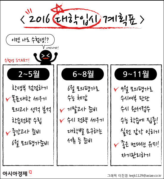 [아시아경제 오진희 기자] 2015학년도 대입이 마무리돼 가면서 2016학년도 대입 시즌이 사실상 시작됐다. 지난해와 마찬가지로 2016학년도에도 쉬운 수능의 기조는 쉽게 변하지 않을 것이란 전망이다. 하지만 쉬운 수능이라고 해서 크게 학습량이 줄어들거나, 학습전략이 간단해지는 것은 아니다. 유웨이중앙교육의 도움으로 지금부터 11월까지의 입시 스케줄을 고려해, 학생부와 수능 준비 전략을 점검해 봤다. ◆2~5월, 목표대학 세우고, 학생부 점검하고 대비하기= 본격적인 고3 수험생활의 시작이다. 이때는 학생부 성적을 감안해 목표 대학을 세운 후에 첫 모의고사에 임하는 것이 좋다. 3월 중 교육청에서 시행되는 첫 모의고사는 현재 자신의 위치와 취약점을 동시에 파악할 수 있다. 모의고사가 끝난 후에는 성적 결과에 일희일비하지 말고 자신의 성적을 냉철하게 분석한 후 남은 기간 동안 취약점을 보완하기 위한 학습전략을 수립하는 것이 좋다. 또한 이 시기에는 학교별로 중간고사가 치러져 재학생의 경우, 중간고사 준비도 해야 한다. 여기에 6월 모의평가도 앞두고 있다. 기출 문제를 통해 모의평가의 출제경향을 미리 점검해 보고, 부족한 부분을 보완해, 시험에 임하는 것이 좋다.◆6~8월, 6월 모의평가 결과를 바탕으로 여름방학 학습 몰입= 6월에는 수능 출제기관인 한국교육과정평가원의 첫 모의평가가 실시된다. 수능을 미리 체감할 수 있는 시험이다. 또한 7월에는 기말고사가 학교별로 실시된다. 중간고사와 마찬가지로 수능 때문에 학생부 관리를 소홀히 해서는 안 된다. 8월 여름방학은 수능 준비에 있어 매우 중요하다. 이와 함께 수시 전략을 본격적으로 세워야 하는 시기다. 9월 모의평가가 끝나고 계획을 세우기에는 턱없이 시간이 부족하다. 1학년부터 3학년까지의 학생부를 대학별 학생부 산출 방법에 따라 환산 점수 산출 후 유·불리를 분석하고, 대학에서 요구하는 자기소개서를 비롯한 각종 서류 및 대학별고사를 틈틈이 준비해야 한다. ◆9~11월, 수시 원서접수 후 수능 학습에 집중= 9월 모의평가는 수시 최저학력기준 통과 여부를 판단해 볼 수 있는 시험이다. 이 시기에는 수시 원서 접수로 자칫 수능 학습 패턴을 잃을 수 있다. 마음이 바쁜 시기일수록, 자기관리와 학습 계획이 필요하다. 10월부터는 실전 감각을 위해 주 1회 정도는 실제 수능과 똑같은 조건을 갖춘 상태에서 준비를 하는 것이 좋다. 수능일 최상의 컨디션을 유지하기 위해서는 세심한 체력 관리도 필수다. 충분한 수면 시간과 숙면을 통해 아침 시간의 두뇌 활동을 상승시키고, 되도록 탈이 날 음식이나 소화가 되지 않는 음식은 섭취하지 않아야 한다. 또한 자신감을 가지고 긴장감을 풀고, 실수를 줄이는 연습도 필요하다. 오진희 기자 valere@asiae.co.kr<ⓒ세계를 보는 창 경제를 보는 눈, 아시아경제(www.asiae.co.kr) 무단전재 배포금지>