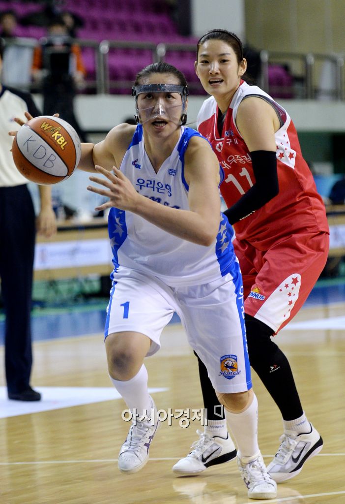 [춘천=아시아경제 김현민 기자] 여자 프로농구 우리은행과 KDB생명의 경기가 21일 춘천호반체육관에서 열렸다. 우리은행 양지희가 상대 이연화의 수비를 뚫고 공격하고 있다. 김현민 기자 kimhyun81@asiae.co.kr<ⓒ세계를 보는 창 경제를 보는 눈, 아시아경제(www.asiae.co.kr) 무단전재 배포금지>