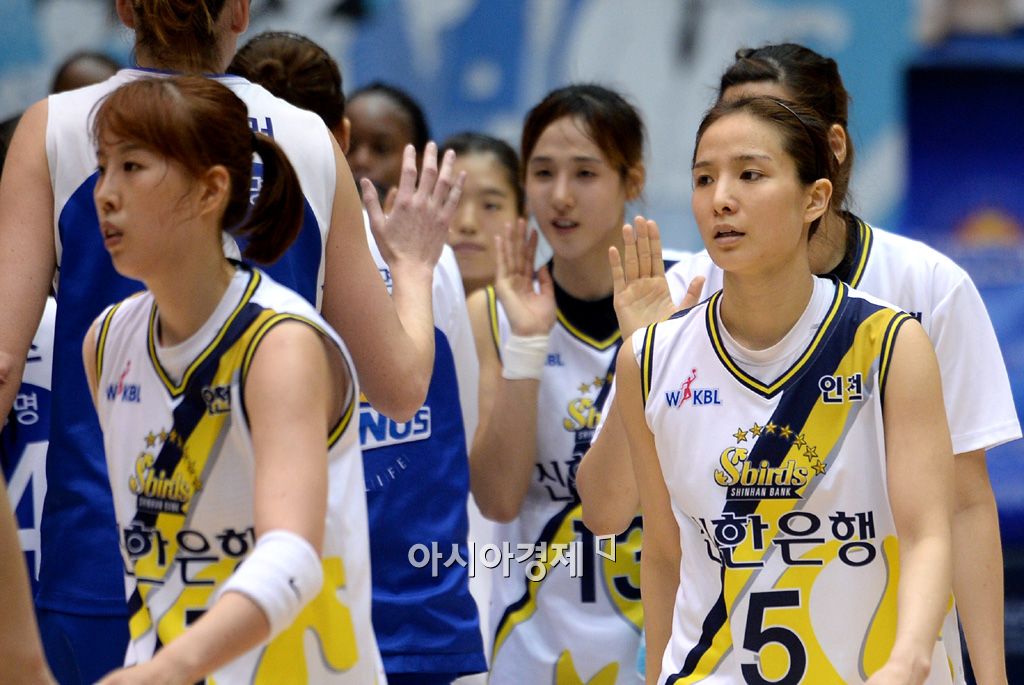 [구리=아시아경제 김현민 기자] 여자 프로농구 KDB생명과 신한은행의 경기가 26일 구리시체육관에서 열렸다. 68 대 59로 승리한 신한은행 선수들이 상대 선수들과 인사를 나누고 있다. 김현민 기자 kimhyun81@asiae.co.kr<ⓒ세계를 보는 창 경제를 보는 눈, 아시아경제(www.asiae.co.kr) 무단전재 배포금지>