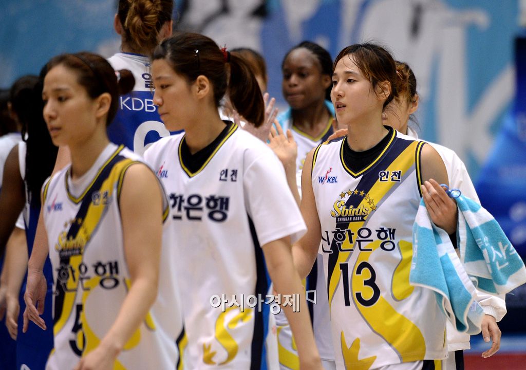 [구리=아시아경제 김현민 기자] 여자 프로농구 KDB생명과 신한은행의 경기가 26일 구리시체육관에서 열렸다. 68 대 59로 승리한 신한은행 김단비가 상대 선수들과 인사를 나누고 있다. 김현민 기자 kimhyun81@asiae.co.kr<ⓒ세계를 보는 창 경제를 보는 눈, 아시아경제(www.asiae.co.kr) 무단전재 배포금지>
