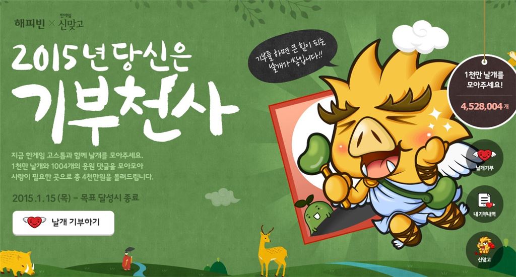 [아시아경제 박나영 기자] NHN엔터테인먼트(대표 정우진)는 자사가 운영하는 한게임 '고스톱'이 해피빈과 연계해 ‘천만 날개 모으기’ 기부 프로모션을 진행한다고 27일 밝혔다.이번 프로모션은 국민 게임으로 사랑받아온 ‘한게임 신맞고’가 그 동안 받은 사랑을 보답하고자 마련한 행사로, 한게임과 해피빈 양 채널에서 동시에 참여가 가능하다.한게임 사이트에서는 ‘2015년 당신은 기부천사’ 코너를 통해 사랑의 날개를 기부하면 된다. 1000만 날개를 달성하면 미션이 완성된다. 기존 고스톱 이용자라면 게임 이용만 하더라도 자동으로 기부 참여가 가능하다. 두 가지 미션이 완성되면 NHN엔터와 해피빈이 약속한 지정기부처에 기부금이 제공되는데, 포천시 무한돌봄복지센터와 대전광역시 복된지역아동센터, 그리고 경남 함안 칠원지역아동센터 행복한공부방 세 곳에 나눔을 전하게 된다.기부에 동참하는 이용자 중 가장 많은 기부를 한 1인에게는 신세계상품권(50만원)과 한게임 고스톱 USB와 고스톱 세트, 수건을 증정하며, 상위 13인에게는 GS주유상품권(1만원)과 다양한 고스톱 관련 선물 세트를 제공한다.박나영 기자 bohena@asiae.co.kr<ⓒ세계를 보는 창 경제를 보는 눈, 아시아경제(www.asiae.co.kr) 무단전재 배포금지>
