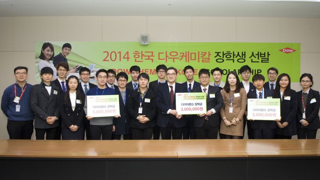 한국다우케미칼 이제훈 사장과 '한국다우케미칼 장학 프로그램' 장학생들이 함께 단체사진을 촬영하고 있다.