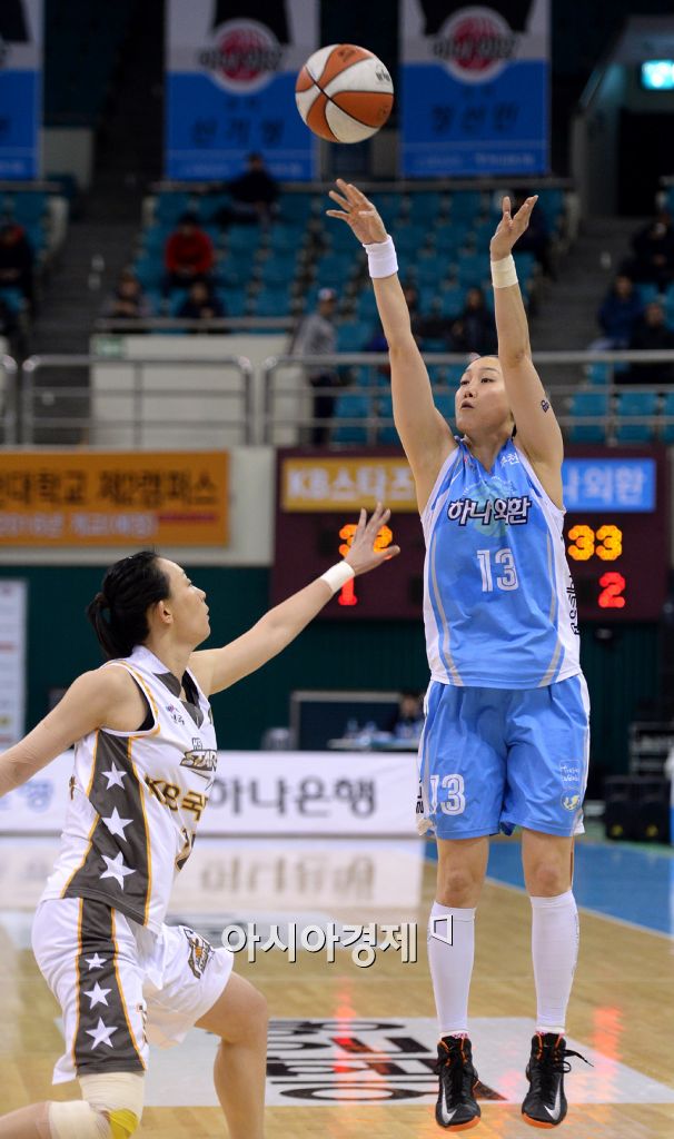 [부천=아시아경제 김현민 기자] 여자 프로농구 하나외환과 KB스타즈의 경기가 28일 부천체육관에서 열렸다. 하나외환 김정은이 상대 변연하의 수비를 뚫고 공격하고 있다. 김현민 기자 kimhyun81@asiae.co.kr<ⓒ세계를 보는 창 경제를 보는 눈, 아시아경제(www.asiae.co.kr) 무단전재 배포금지>