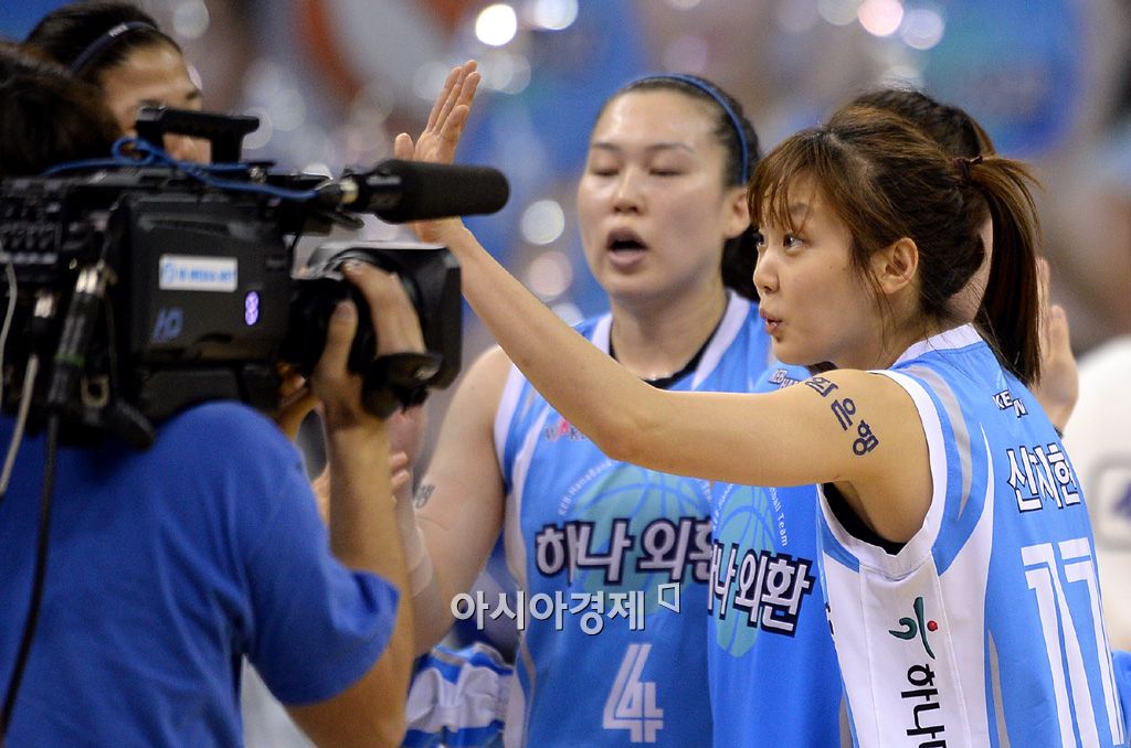 [부천=아시아경제 김현민 기자] 여자 프로농구 하나외환과 KB스타즈의 경기가 28일 부천체육관에서 열렸다. 68 대 58로 승리한 하나외환 신지현이 동료들과 기쁨을 나누고 있다. 김현민 기자 kimhyun81@asiae.co.kr<ⓒ세계를 보는 창 경제를 보는 눈, 아시아경제(www.asiae.co.kr) 무단전재 배포금지>