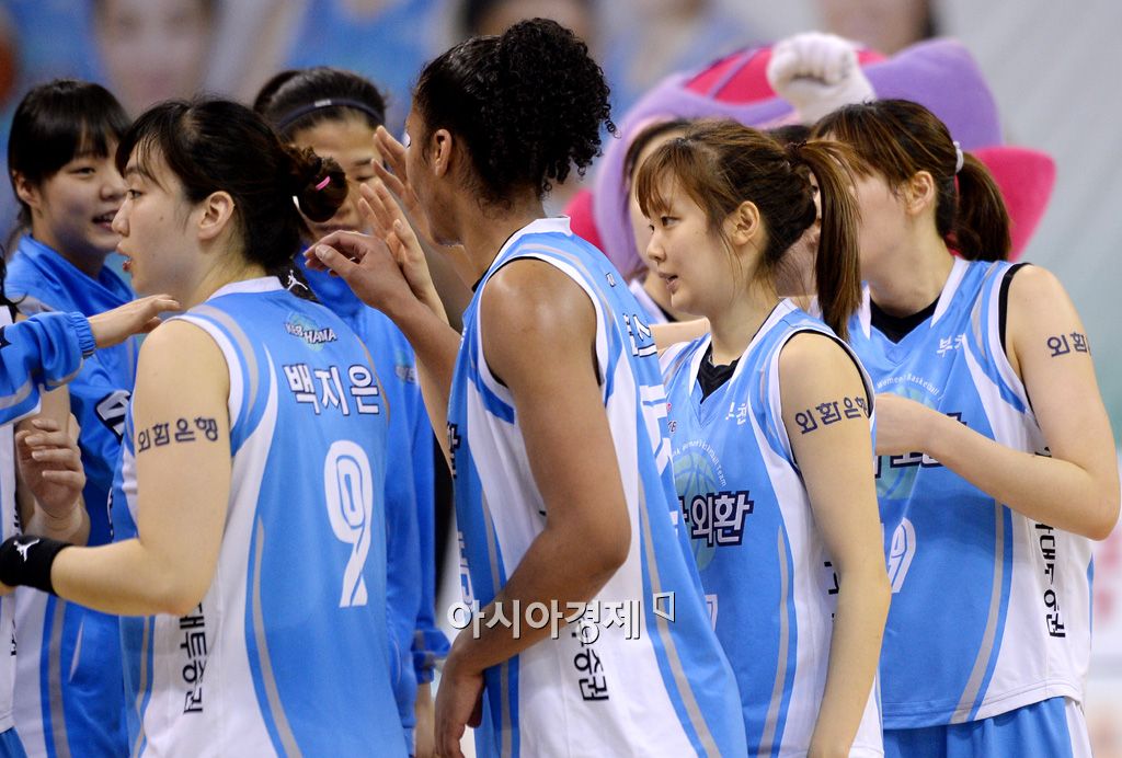 [부천=아시아경제 김현민 기자] 여자 프로농구 하나외환과 KB스타즈의 경기가 28일 부천체육관에서 열렸다. 68 대 58로 승리한 하나외환 신지현이 동료들과 기쁨을 나누고 있다. 김현민 기자 kimhyun81@asiae.co.kr<ⓒ세계를 보는 창 경제를 보는 눈, 아시아경제(www.asiae.co.kr) 무단전재 배포금지>