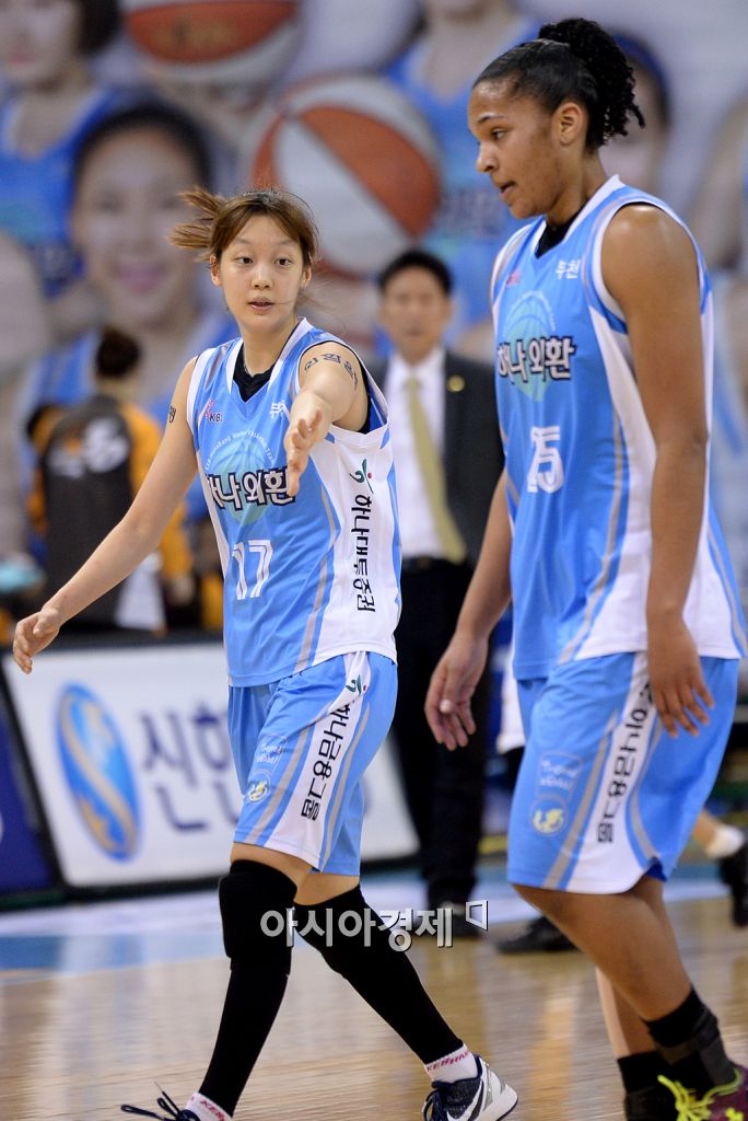 [부천=아시아경제 김현민 기자] 여자 프로농구 하나외환과 KB스타즈의 경기가 28일 부천체육관에서 열렸다. 하나외환 신지현이 토마스와 하이파이브하고 있다. 김현민 기자 kimhyun81@asiae.co.kr<ⓒ세계를 보는 창 경제를 보는 눈, 아시아경제(www.asiae.co.kr) 무단전재 배포금지>