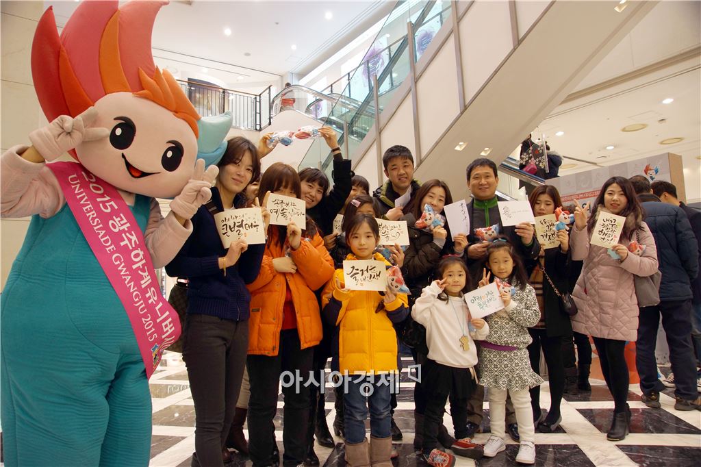 지난 1월 17일 광주신세계백화점에서 열린 광주U대회 켈리그라피(그림문자) 새해소망 기원 이벤트에서 시민들과 누리비가 대회 성공개최를 응원하고 있다.