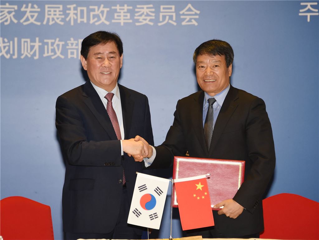 최경환 부총리 겸 기획재정부 장관이 1월 29일 중국 북경에서 열린 '제13차 한-중 경제장관회의'에 참석, 쉬 사오스 중국 국가발전개혁위원회 주임과 합의의사록에 서명한 뒤 악수하고 있다.