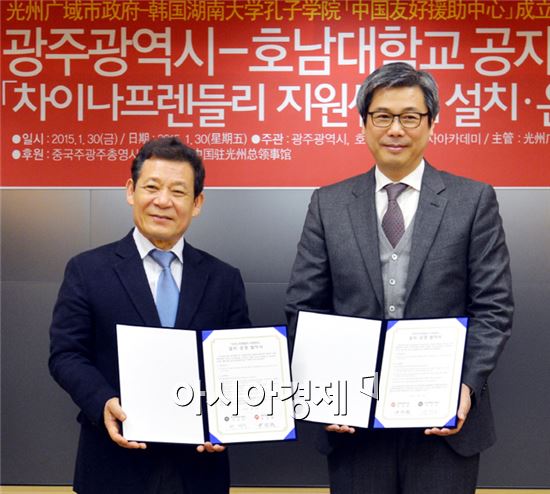 윤장현 광주광역시장은 세계 G2로 급부상하고 있는 중국과의 우호환경을 조성하고 교류를 확대하기 위해 30일 오후 시청 비즈니스룸에서 서강석 호남대학교 총장과 ‘차이나프렌들리 지원센터’ 설치·운영 협약을 체결했다. 사진제공=광주시