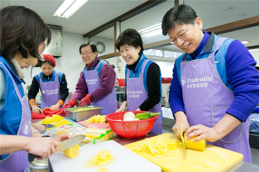 손병옥 푸르덴셜생명 사장(오른쪽 두번째)과 임원들이 서울 강서구 가양7종합사회복지관을 찾아 탈북 주민과 60세 이상 저소득 노인들을 위한 도시락과 식사를 준비하고 있다.