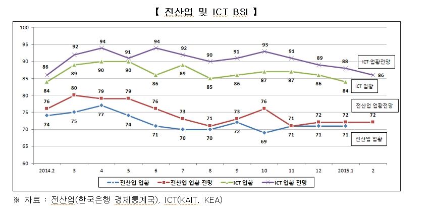 ICT BSI, 2월 전망지수 전월대비 2p 하락한 86 기록 [아시아경제 이초희 기자]2월에도 국내 정보통신기술(ICT) 기업들의 경기 회복은 불투명할 것으로 보인다. ICT기업 경기실사지수(BSI)가 4개월 연속 하락했다.2일 한국정보통신진흥협회(회장 하성민)와 한국전자정보통신산업진흥회(회장 권오현)가 공동으로 ICT분야 1647개 기업체를 대상으로 실시한 '2015년 1월 ICT 기업경기조사' 결과 지난달 ICT 업황 BSI는 84로 전월(86)대비 2p 하락했다. 2월 업황 전망BSI도 전월(88)대비 2p 하락한 86을 기록하며 4개월 연속 내리막을 나타냈다.BSI는 응답내용을 3점 척도(나쁨, 보통, 좋음)로 구분해 100 이상이면 다음 달 경기가 좋아질 것으로 전망한 업체가 그렇지 않을 것으로 보는 업체보다 더 많음을 나타내며, 100 미만이면 그 반대를 뜻한다.KAIT 관계자는 "유가 급락, 중국 성장세 둔화, 유럽의 경기 침체 등으로 대외 변동성이 커지고, 국내의 저성장, 저물가, 세제현안이슈 등으로 인한 국내소비심리위축 등이 기업들의 부정적 전망에 반영된 것"이라고 분석했다.부문별 업황BSI로 정보통신서비스, 정보통신방송기기는 전월대비 하락한반면 소프트웨어는 상승했다. 업황 전망BSI는 정보통신서비스ㆍ소프트웨어는 전월대비 하락했으며 정보통신방송기기는 전월과 동일했다. 정보통신방송서비스 업황BSI(87→85)는 전월대비 2p 하락했고 업황 전망BSI(88→84)도 4p 떨어졌다. 정보통신방송기기 업황BSI(83→79)는 전월대비 4p 하락, 업황 전망BSI(83→83)는 전월과 동일했다. 소프트웨어 업황BSI(93→94)는 전월대비 1p 상승한 반면 업황 전망BSI(99→93)는 전월대비 6p 하락했다.수준판단 업황BSI 중 제품재고ㆍ생산설비ㆍ고용수준은 전월대비 하락했지만 설비투자실행은 전월대비 올랐다. 자금사정은 전월과 동일했다.업황 전망BSI는 제품재고는 전월대비 상승한 반면 생산설비ㆍ자금사정은 전월대비 하락했고 고용수준ㆍ설비투자실행은 전월과 동일할 것으로 전망됐다.제품재고(101→102), 생산설비(102→101)는 약간의 과잉상태가 지속되고 자금사정(95→94)은 부족상태가 지속될 것으로 전망됐다.(자료-KAIT)