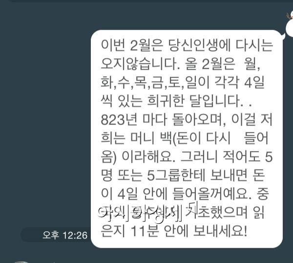 823년 만에 돌아온 '2월'…근거 없는 '머니백' 메시지의 진실은? [아시아경제 온라인이슈팀] 823년 만에 달력을 꽉 채운 '2월'이 돌아왔다는 근거 없는 정보가 SNS, 카카오톡 등을 중심으로 떠돌고 있다. 최근 인터넷과 모바일 등에서는 이번 2월이 우리 인생에서 다시 오지 않는 복된 달이라는 의미에서 이른바 '머니백 월'이라고 불린다. 이는 돈이 다시 돌아온다는 의미로 중국 풍수에서 기초했다고 알려졌다. 이에 카카오톡 등 모바일에서는 '행운의 편지'와 비슷한 '머니백' 글귀가 담긴 메시지를 5명이나 5그룹한테 읽은 지 11분 안에 보내면 돈이 4일 안에 들어올 것이라는 낭설이 떠돌고 있다.2015년 2월 달력