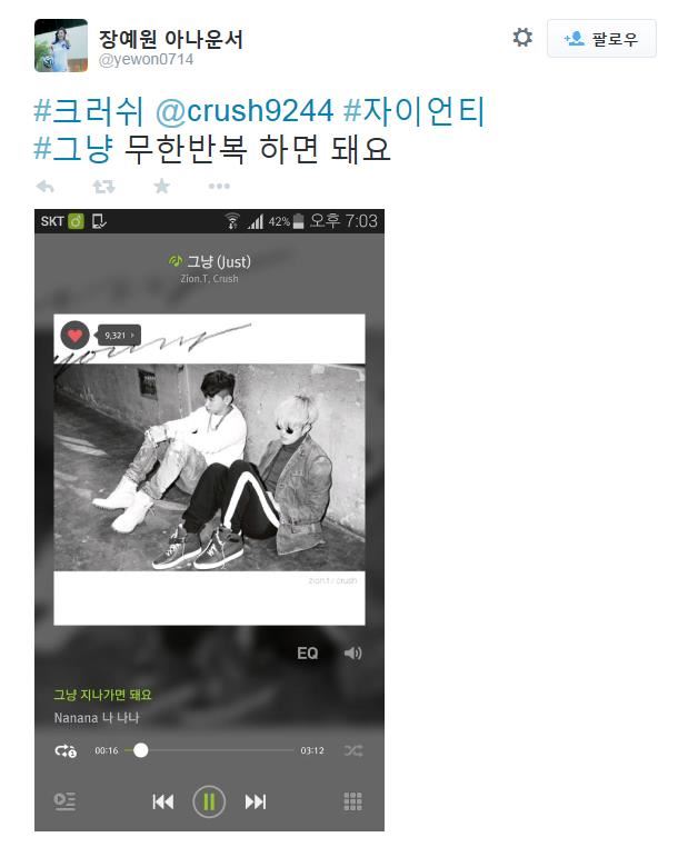 장예원 "자이언티-크러쉬 그냥 무한반복 하세요" 지원 사격 이유는? [아시아경제 온라인이슈팀] 가수 자이언티와 크러쉬의 '그냥 (Just)'이 공개와 동시에 음원차트를 휩쓴 가운데, 장예원 SBS 아나운서가 지원사격에 나섰다.장예원은 2일 트위터를 통해 자이언티와 크러쉬의 '그냥 (Just)' 스트리밍 캡처 사진과 함께 "크러쉬, 자이언티 그냥 무한반복하면 돼요"라는 글을 게재했다. 장예원은 크러쉬와 친분이 있는 것으로 알려졌다.앞서 이날 정오 공개된 자이언티&크러쉬의 프로젝트 앨범 '영(Young)' 의 타이틀 곡 '그냥(Just)'은 발표와 동시에 멜론, 엠넷, 벅스, 소리바다, 올레뮤직, 네이버뮤직 등 각종 음원차트에서 1위를 휩쓸며 '대세남'임을 입증하고 있다.'그냥(Just)'은 자이언티와 크러쉬가 직접 작사·작곡에 참여한 곡으로, 짝사랑, 이별에 대한 다양한 시선과 감정을 '그냥'이라는 함축적 단어로 표현해 눈길을 끌었다.특히 구구절절 늘어놓지 않아도 감정이 전해질 수 있도록 가사를 줄이고 멜로디로 곡의 여백을 채워 새로운 시도라는 평을 듣고 있다.온라인이슈팀 issue@asiae.co.kr<ⓒ세계를 보는 창 경제를 보는 눈, 아시아경제(www.asiae.co.kr) 무단전재 배포금지>